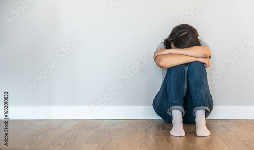 Sad woman sitting on a floor alone in empty room, despair and lonely concept with copy space