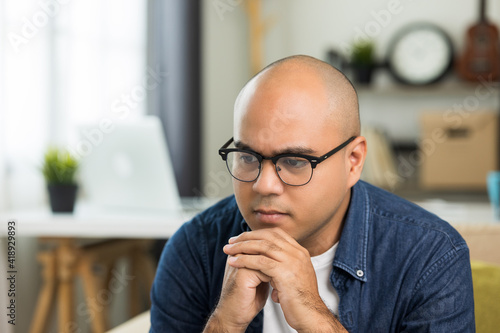 Sadness asian man sitting on sofa in living room and thinking. Emotional depressed and stressed.