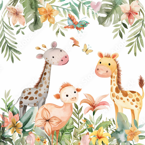 Safari Animals heds Floral Tropical Flower Girl Nursery Wall Art Watercolor