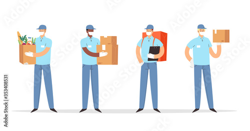 Safe Delivery Concept. Couriers hold boxes in medical masks and gloves, delivers the package, parcel or food during quarantine. Contact free 24/7 delivery service during Coronavirus