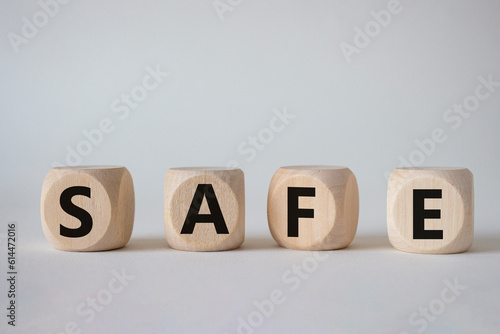 Safe symbol. Concept word Safe on wooden cubes. Beautiful white background. Business and Safe concept. Copy space.