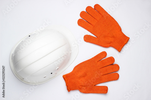 Safety equipment. Construction helmet, gloves on a white background. Top view