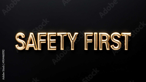 safety first word gold metallic shiny lettering on plain black background