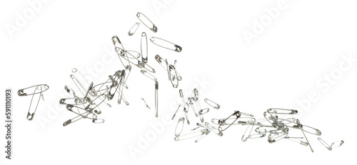 Safety Pin brooch pour fall down, explosion in air. Many safety pin small size splash fly in group floating. White background isolated high speed shutter freeze motion