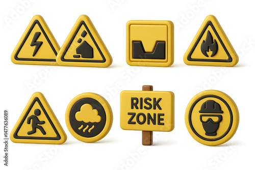 Safety warning icons set – 3d, caution, hazard, alert signs for workplace