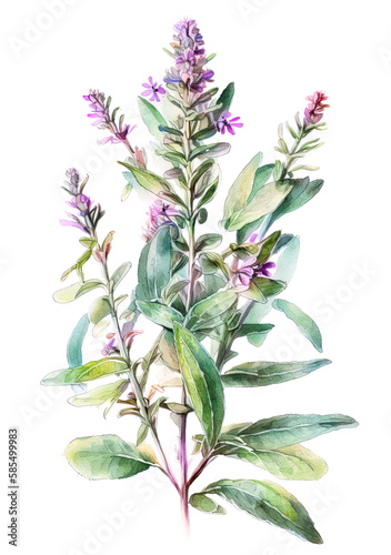 Sage plant with flowers. Generative AI illustration in watercolour style
