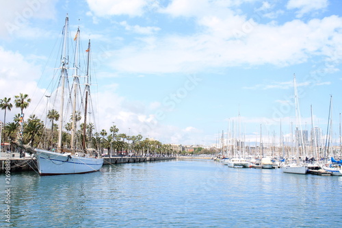 Sail boat in Marina Port Vell, a waterfront harbor in Barcelona, Catalonia, Spain