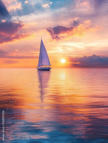 sailboat gliding through the calm sea toward the setting sun.