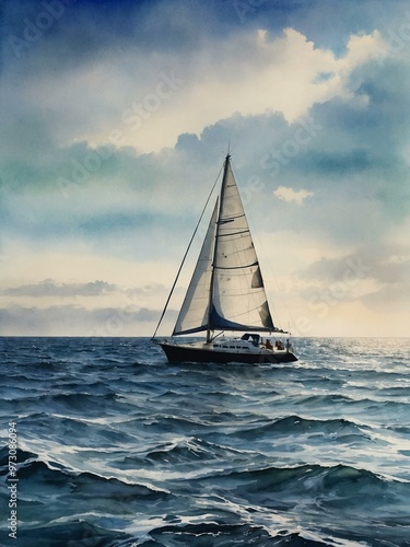 Sailboat on the horizon, dramatic ocean scene, watercolor.