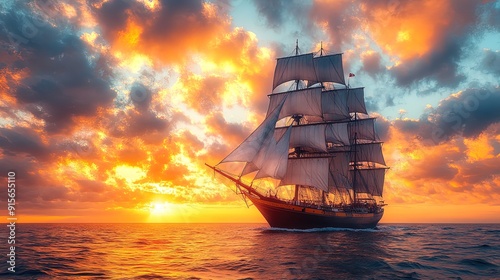 Sailing ship crossing the ocean at sunset with dramatic sky