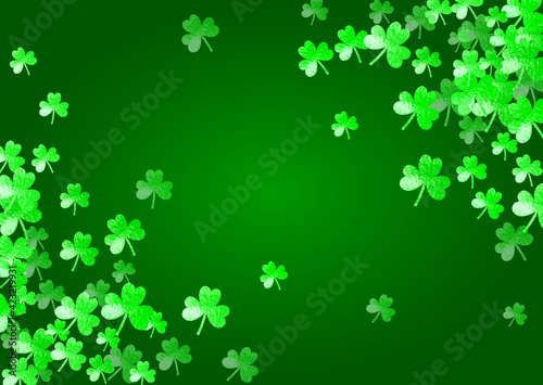 Saint patricks day background with shamrock. Lucky trefoil confetti. Glitter frame of clover leaves. Template for flyer, special business offer, promo. Irish saint patricks day backdrop.