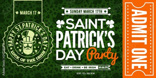 Saint Patrick's Day party celebration invitation, ticket, admit one. Vector illustration