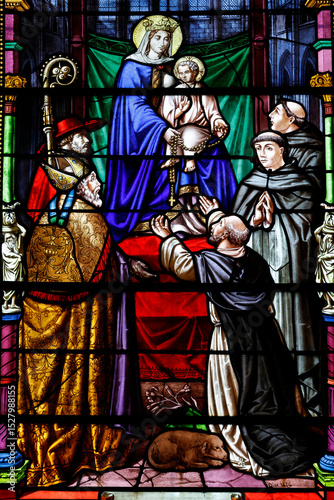 Saint Pierre church. Stained glass. Saint Dominic receiving the Rosary from the Virgin. Toucy. France.
