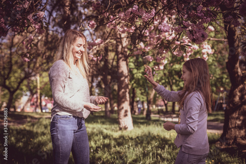 Sakura blossomed. Young mother with her child have fun in the park near the sakura. Spring morning. They look at each other