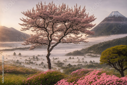 Sakura blossoms in japanese style ornamental garden, beautiful landscape. Generative AI.