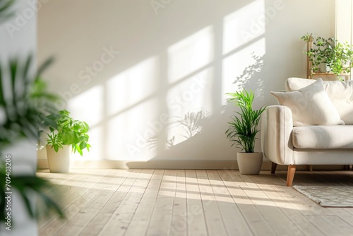 Sala de estar inspirado na natureza, com sofá clean e parede verde com muitas plantas. Criado por IA