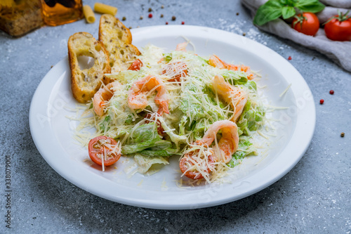 salad caesar with shrimps on white plate