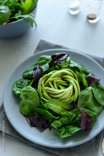 Salad mix with avocado, spinach and beet leaves on gray wooden background. Vegetarian food concept. Selective focus.