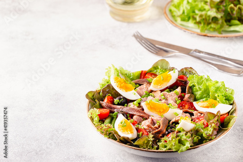 salad Nicoise with tuna, eggs, green beans, tomatoes, olives, lettuce and anchovies