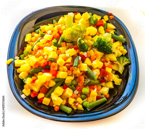 Salad of cauliflower, corn, green peas, asparagus, red bell peppers, carrots and hard cheese in a black plate close-up on a white background