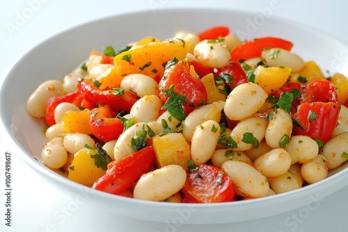 Salad of roasted peppers and butter beans topped with harissa on a white backdrop