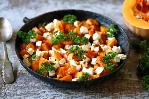 Salad with baked pumpkin and feta. Thanksgiving salad. Autumn keto salad. Keto diet. Selective focus. Macro.