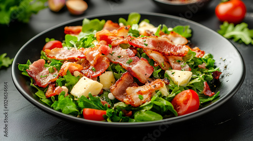 Salad with beef tongue and vegetables on a plate, Restaurant,Grilled sliced meat with roasted vegetables and herbs,Delicious beef steak with salad, herbs and chilli