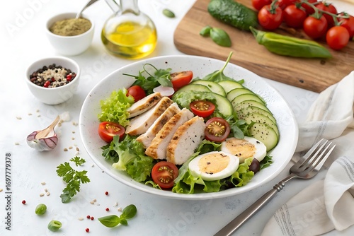 Salad with chicken, tomatoes, cucumbers, and eggs