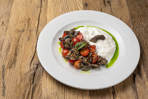 Salad with fried seasonal mushrooms, cherry tomatoes, stracciatella