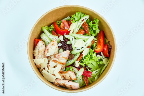 Salad with grilled chicken, parmesan cheese, cherry tomatoes, sun-dried tomatoes, lettuce, red pepper, celery in a cardboard box