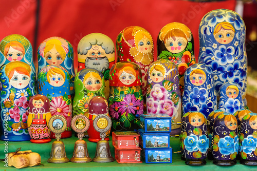 Sale of traditional Russian souvenirs "Matreshka". Russia, Suzdal, September 2017.