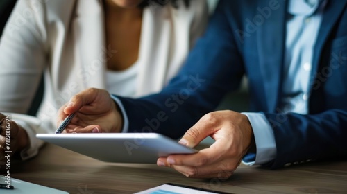 sales representative using a tablet to close a deal with a client in a stylish office setting
