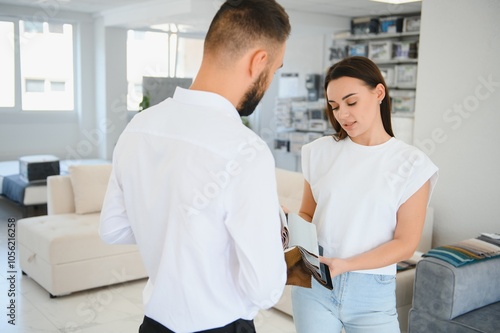 Salesman explaining to woman customer at furniture store