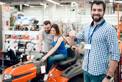 Salesman in checkered shirt is showing couple of clients new cleaning machine in power tools store. Three people celebrating new purchase.
