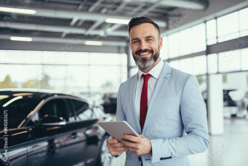 salesman stand in a showroom and hand hold tablet wearing suits smile and happy.