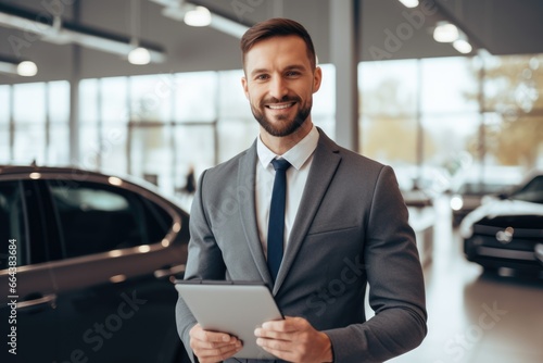 salesman stand in a showroom and hand hold tablet wearing suits smile and happy.