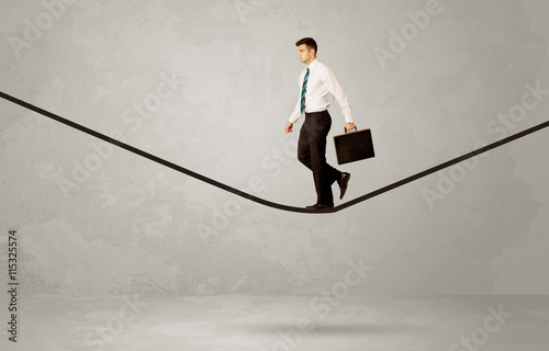 Salesman walking on rope in grey space