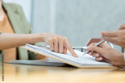 Salesmen are letting the male customers sign the sales contract, Asian women and men are doing business in the office, Business concept and contract signing