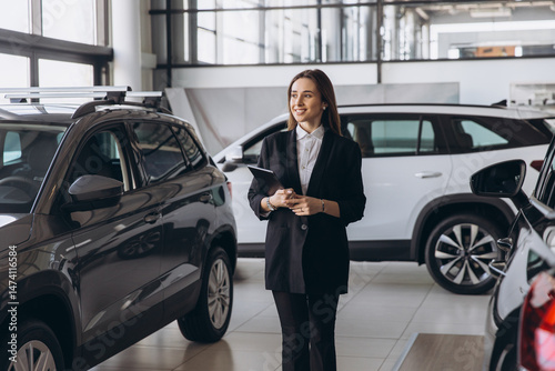 Saleswoman Holding Tablet and Walking in Car Dealership
