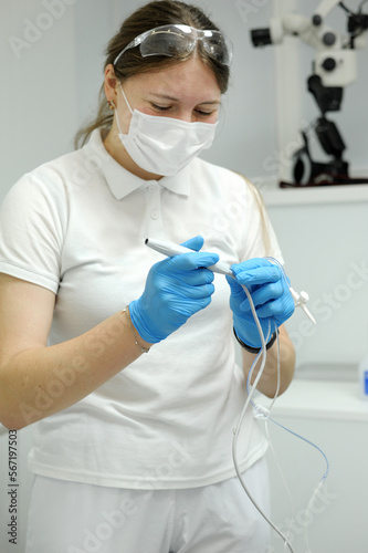 saline gloves dentistry The nurse collects the saline solution of sodium chloride from bottle into the syringe. Antibiotic breeding, vaccination, prevention and treatment of diseases