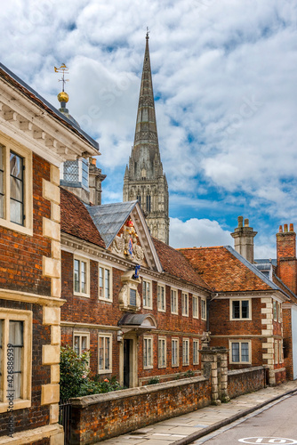 Salisbury Cathedral spire with 17th century alms houses in foreground taken in the High Street, Salisbury, Wiltshire, , England