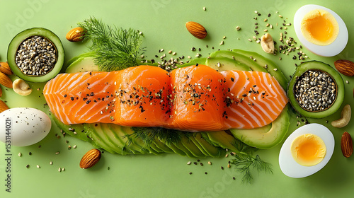 Salmon, avocado, eggs, and nuts arranged on a vibrant green surface.