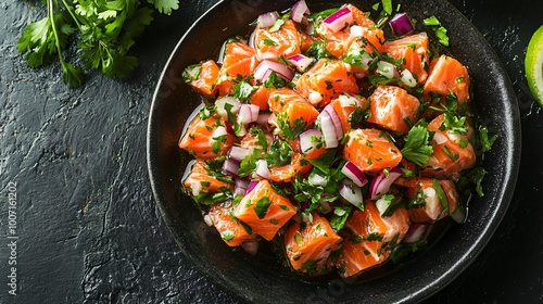 Salmon ceviche with citrus marinade and red onion, styled on a dark stone dish with contrasting fresh herbs
