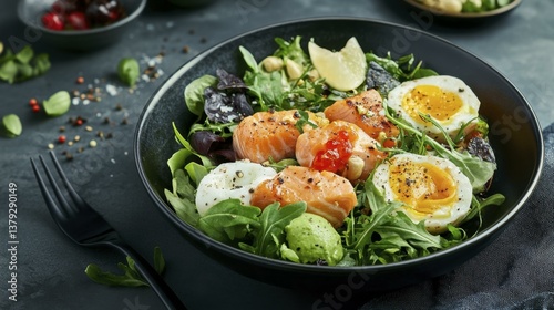 Salmon Egg Salad with Avocado and Greens in Bowl