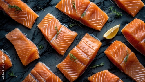 Salmon Fish Fillets on Dark Marble Background with Lemon Slice and Fresh Herbs Top View Culinary Presentation