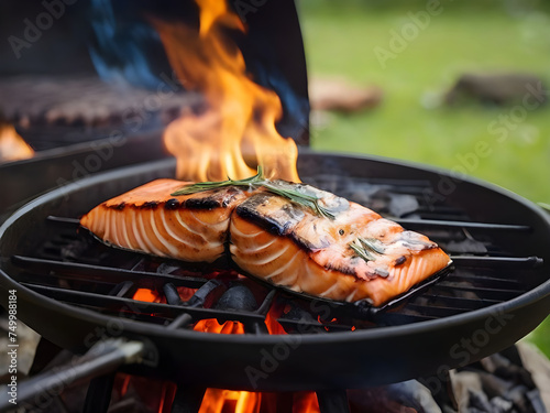 Salmon grilled on a charcoal grill with a red fire and sprinkled with parsley