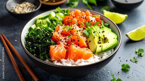 Salmon Poke Bowl with Rice, Avocado, Seaweed Salad, and Fresh Toppings – Delicious and Nutritious