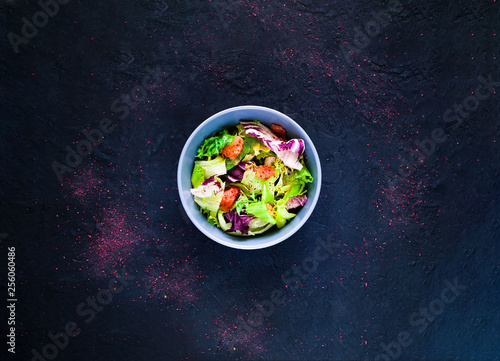 Salmon Poke Salad with spinach and basil. The concept of a tasty and healthy meal.