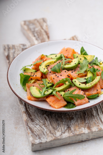 Salmon salad with avocado, for keto and low carb diet. Rusty background, top view, copy space.
