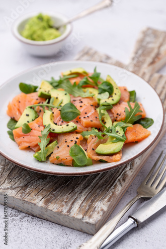 Salmon salad with avocado, for keto and low carb diet. Rusty background, top view, copy space.